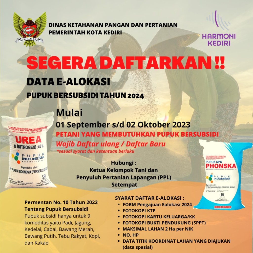 Segera daftar nggih bagi Bapak/Ibu Petani yang membutuhkan, biar tahun 2024 mendapatkan Alokasi sesuai syarat dan ketentuan yang berlaku.